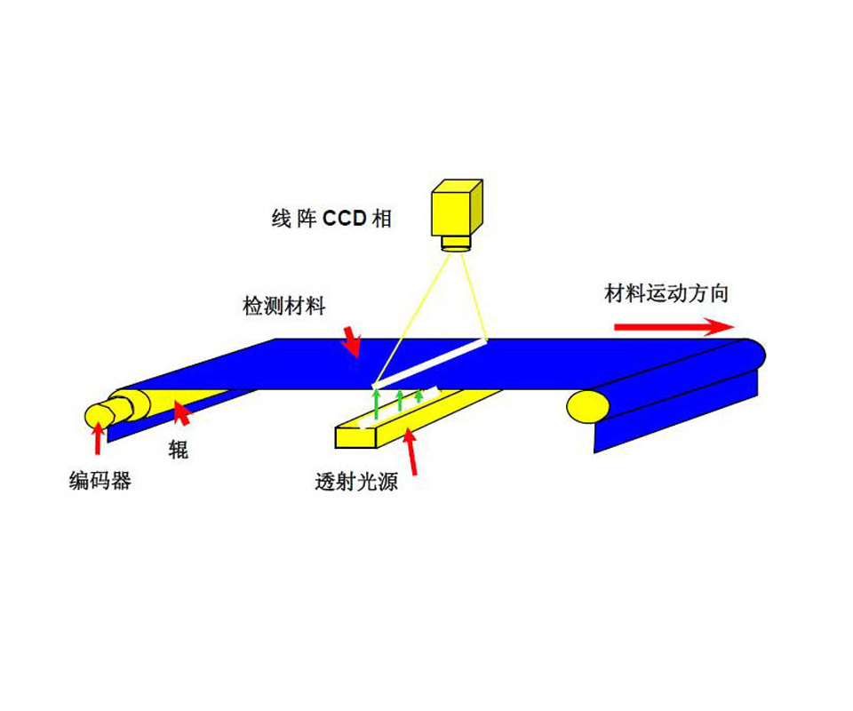 系统整体采用工业CCD相机在线图像扫描的工作原理,在生产线高速生产的状态下,采用特定波长的高亮LED工业线性聚光光源照射产品表面(对于不透明的薄膜产品采用反射的检测原理),通过架设在生产线上的线阵相机实时扫描并采集光源照射处的产品图像。
