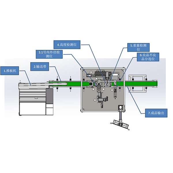 1.自动上料 2自动搬运 3自动检测内径、外圆、锥度、高度、称重 4.不良品剔除 5.良品排料 |
